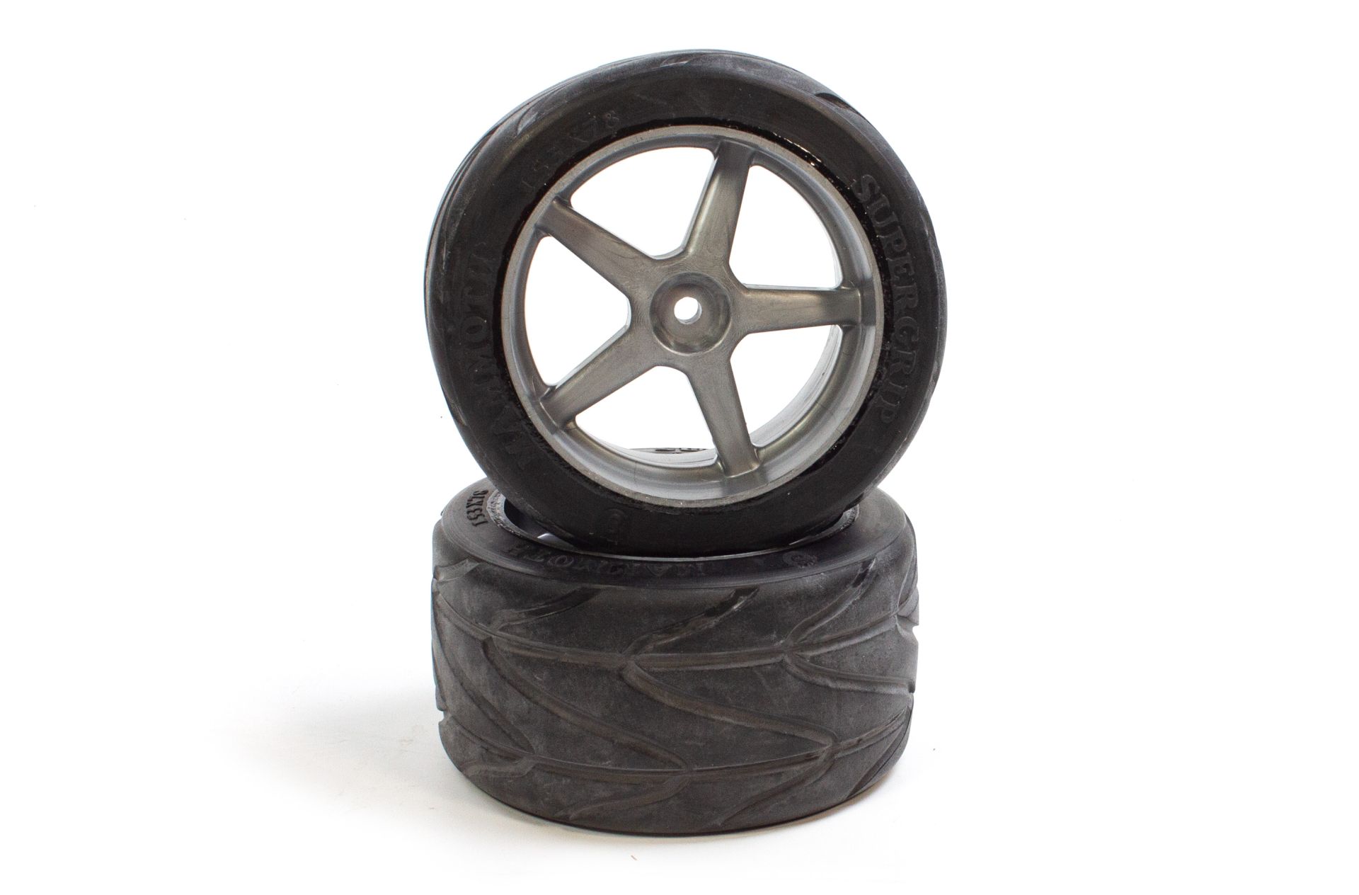 y0580 Mammoth Supergrip for 1/6 and 1/5 offroad cars glued on silver rims.