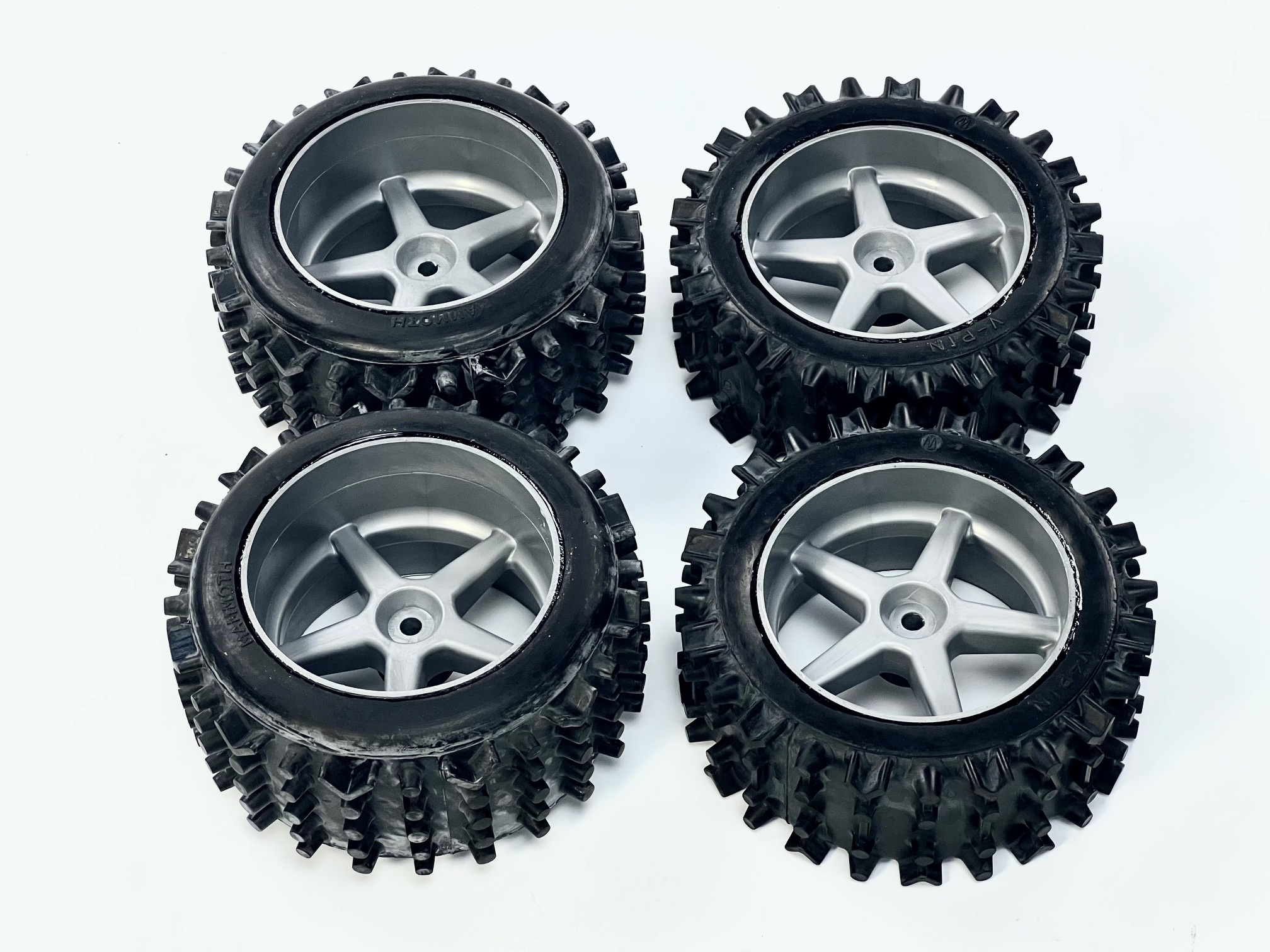 The Mammoth brings, due to its quite strong and large pins and the extreme width of the tire, especially on hard and low grip surfaces a high traction! Where other tires spin helplessly the Mammoth provides serious traction. Due to the high torque load on the bonding of tires on largescale cars, checking the bonding from time to time and re-glueing (y0067) if necessary is unavoidable.