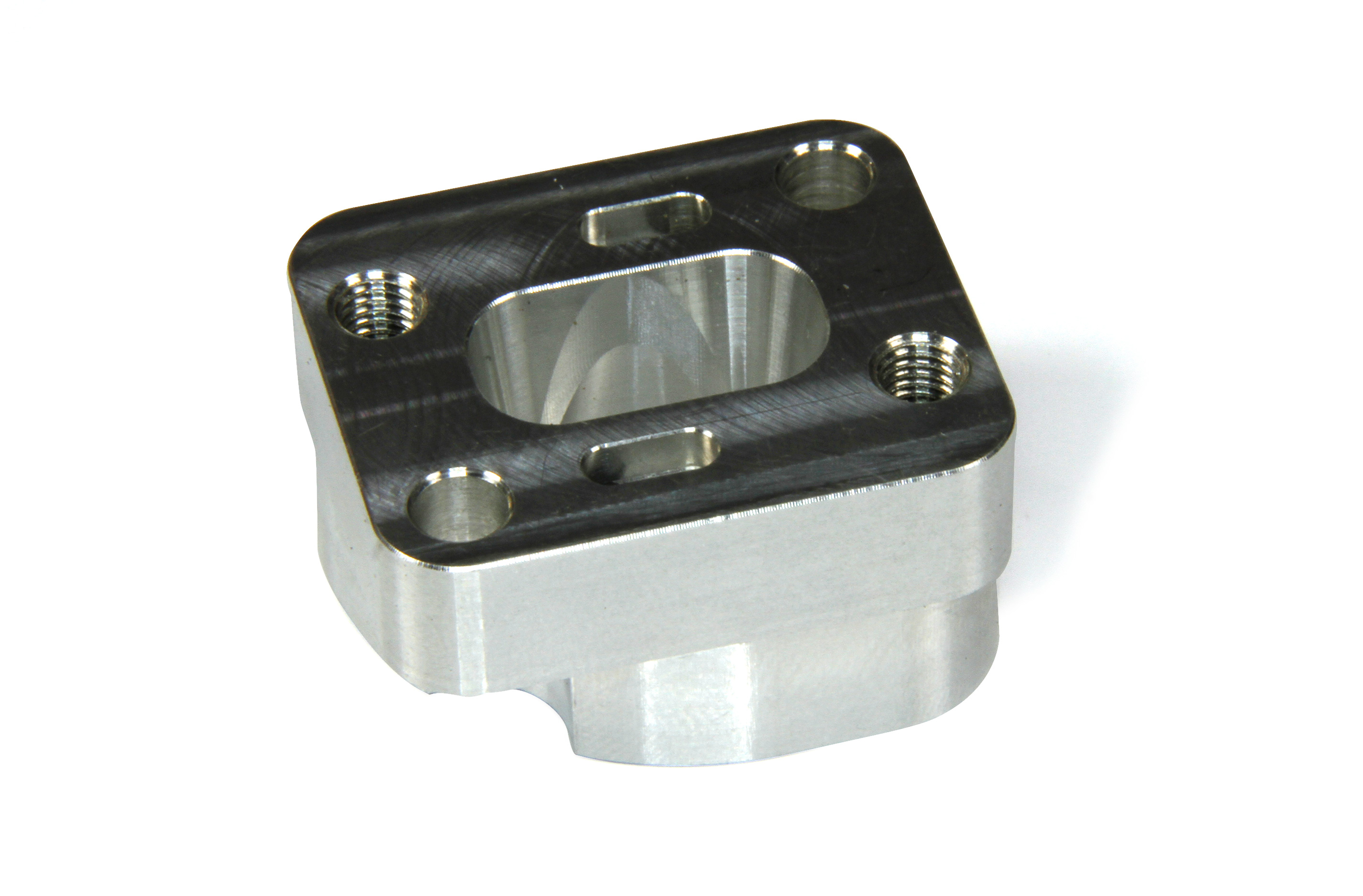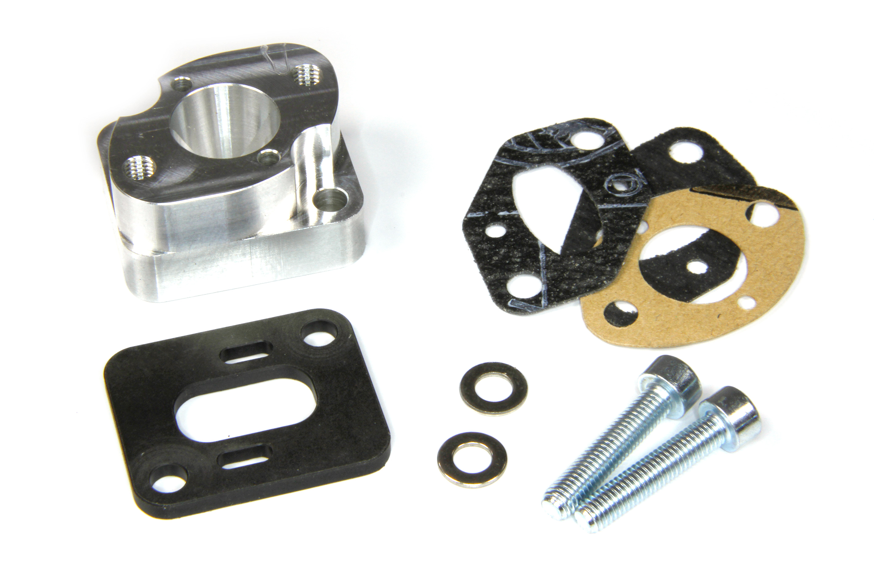 The increased heat transfer of the aluminum is taken into account by addition of an insulator plate. Therefore the aluminum intake is largely insulated. Due to the face-milled surfaces of the aluminum intake you reach a greater durability of the gaskets.