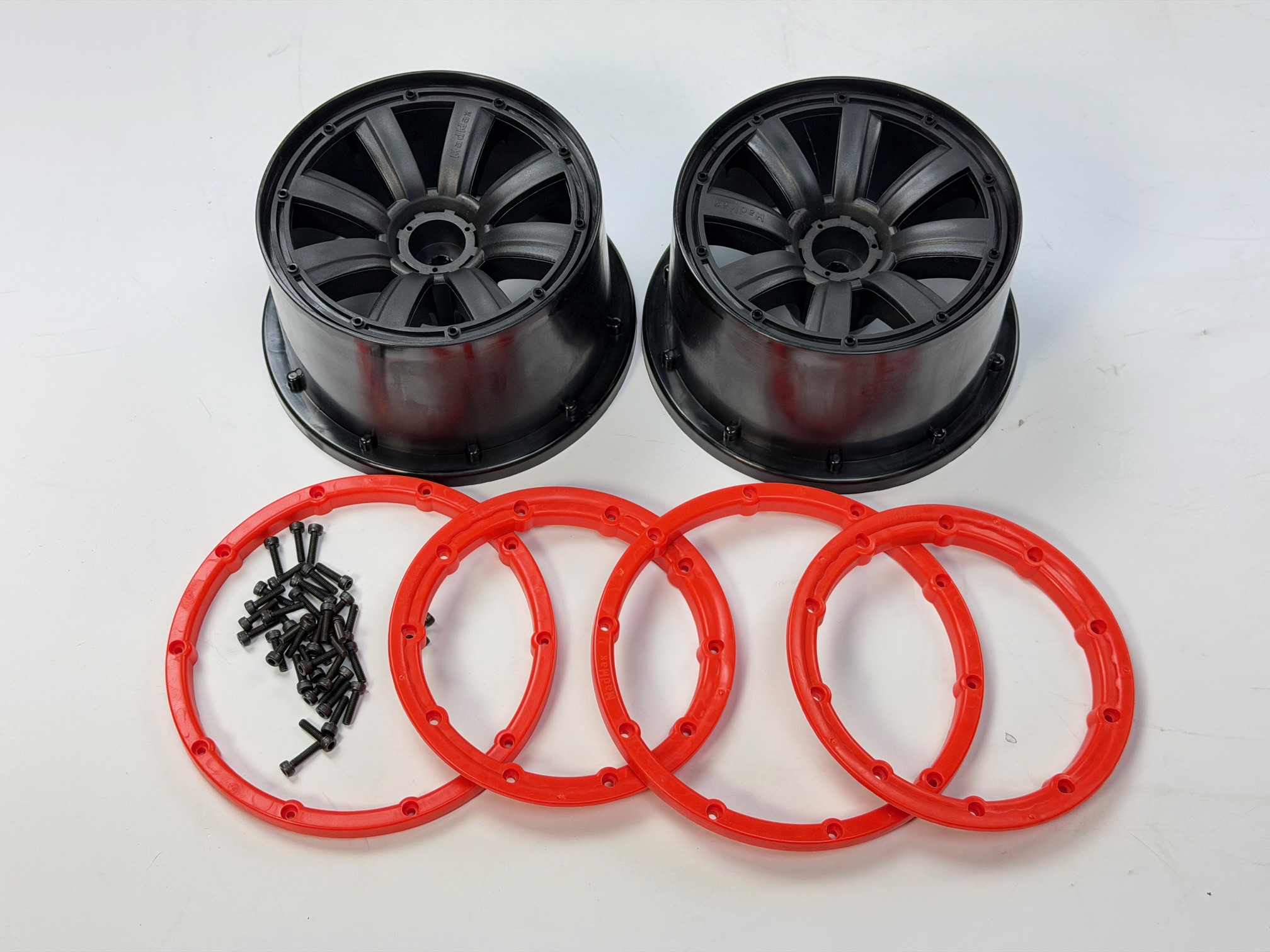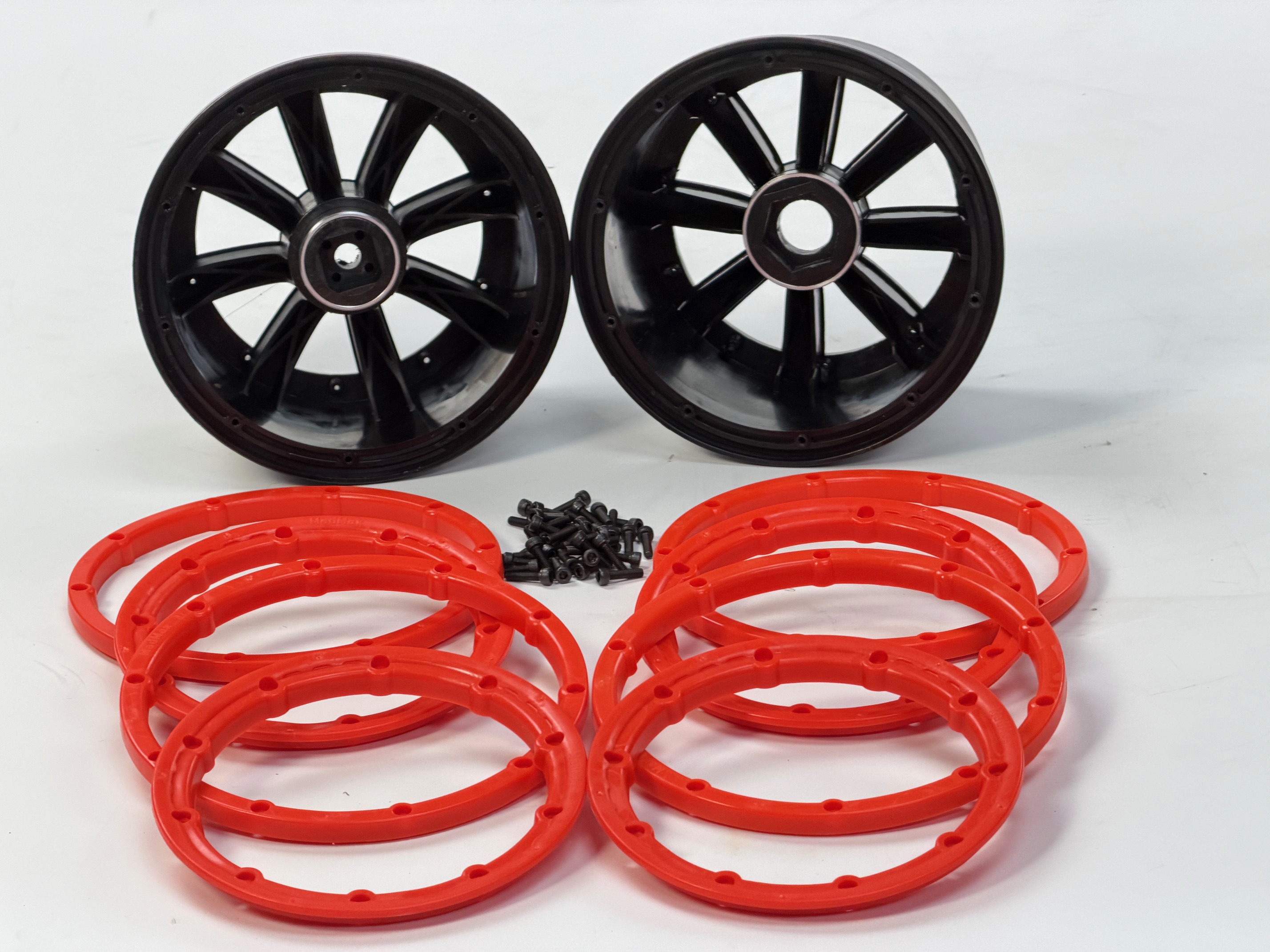Neue, extrem verstärkte MadMax-Felge mit Wahlweise 18 mm Vierkantaufnahme oder 24 mm Sechskantaufnahme und optimierten orangen Felgenringen.