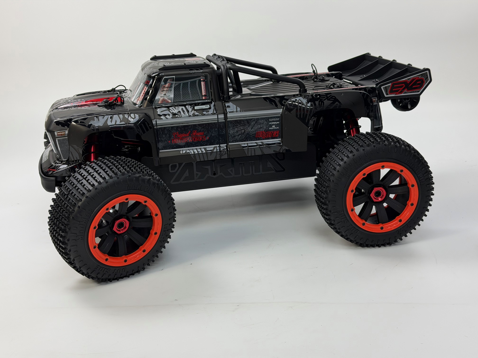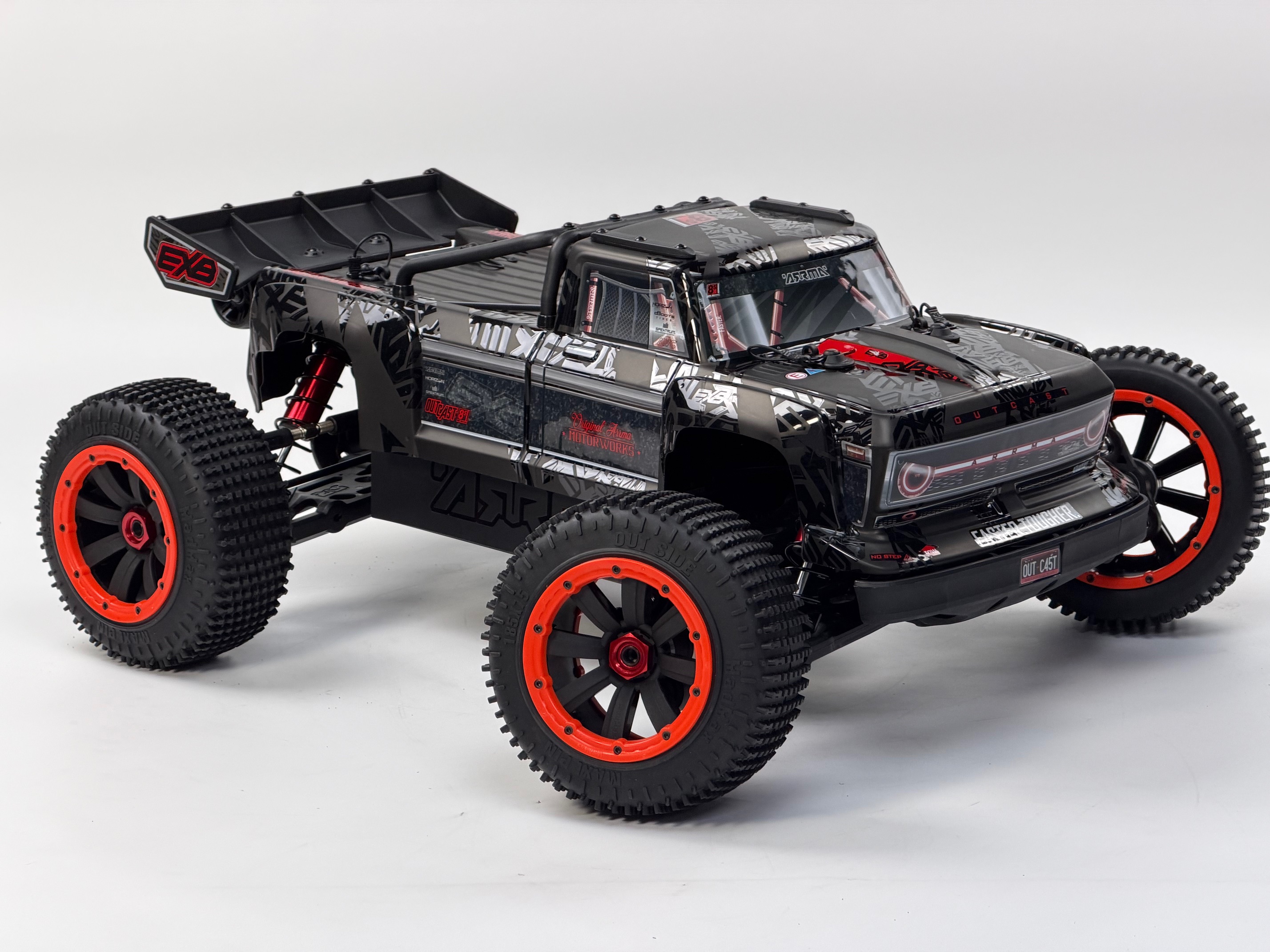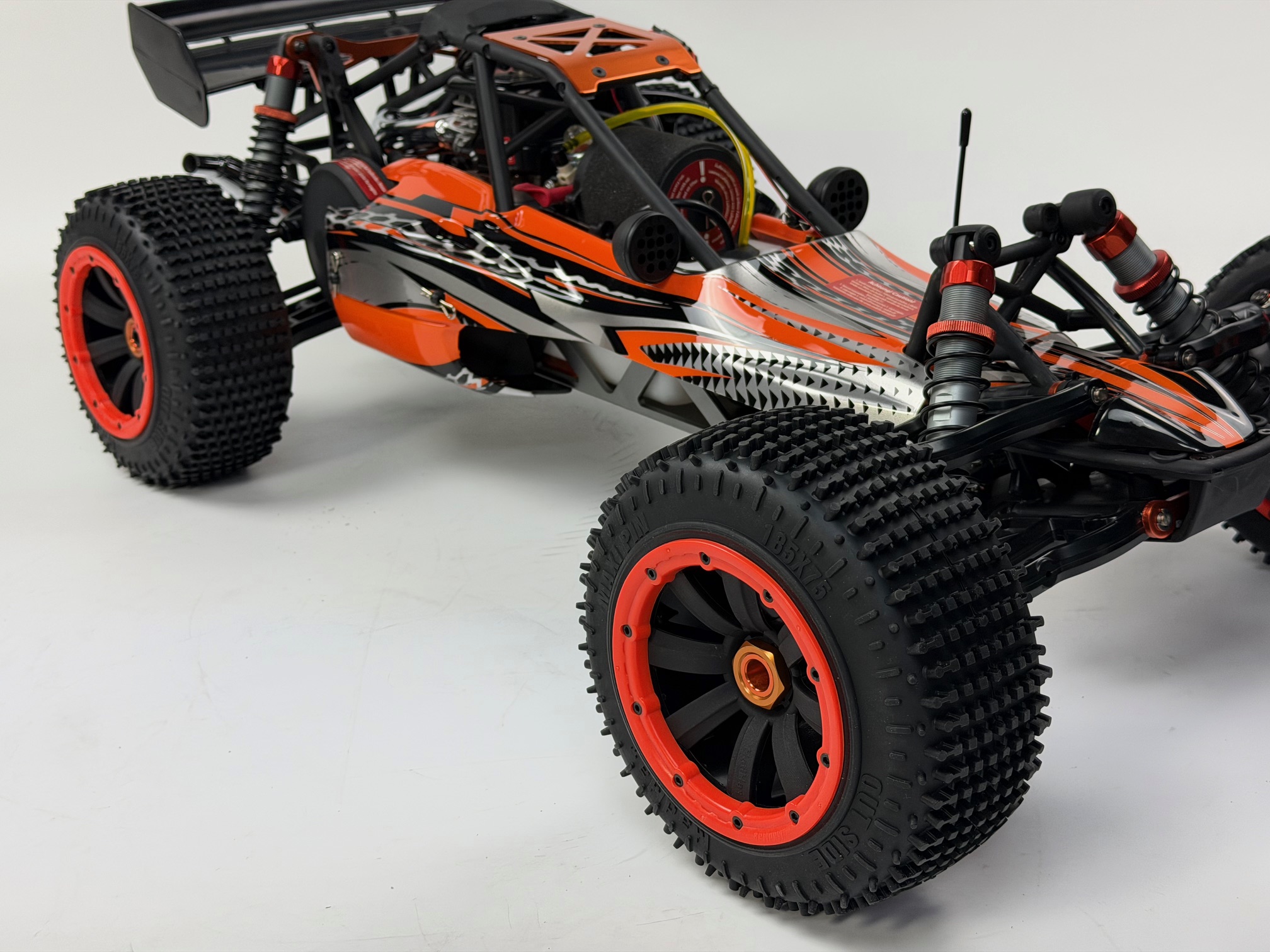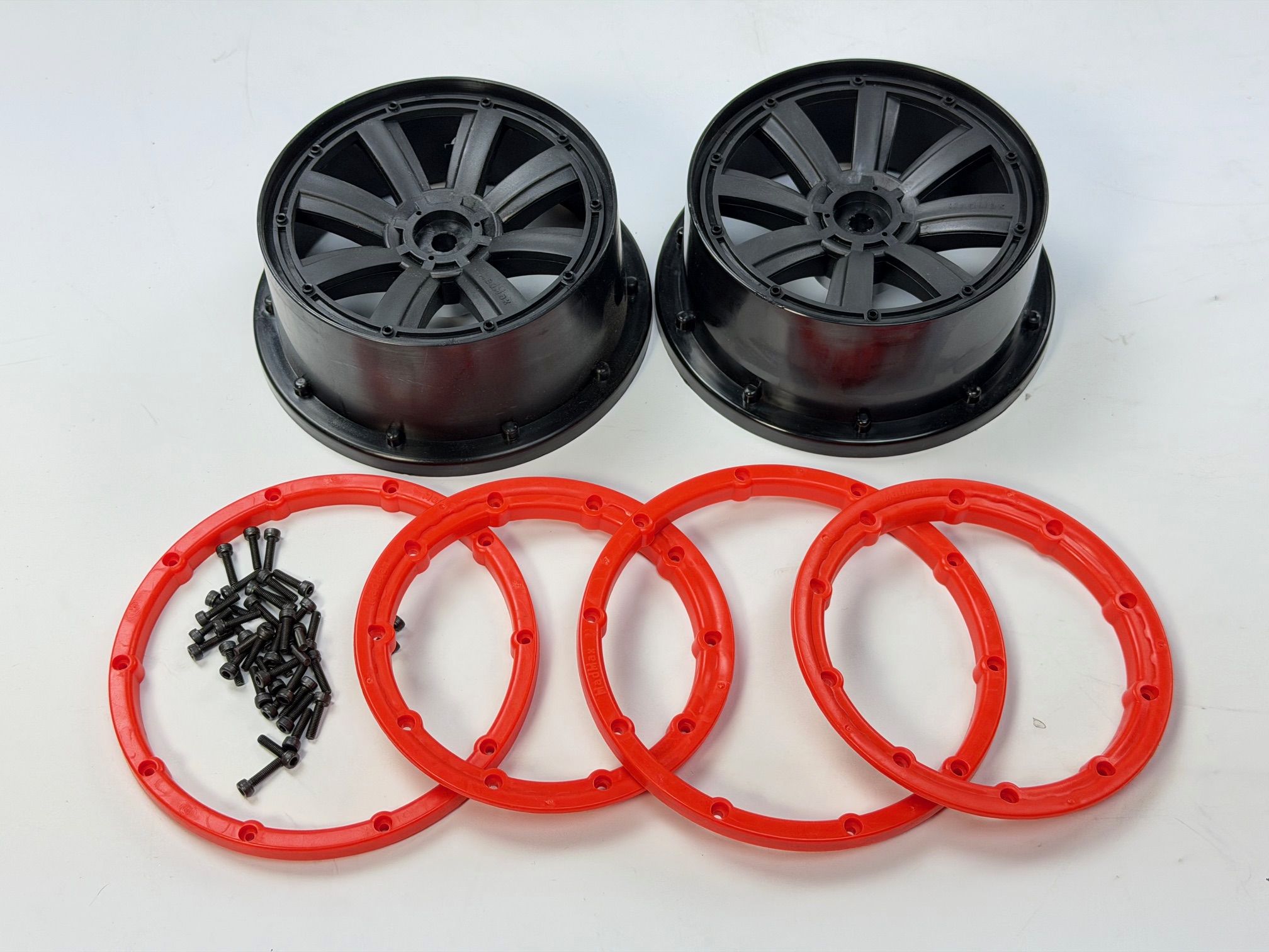 SUPER GRIP 170 x 80 mm and 170 x 60 mm with black MadMax Extreme rims for 18 mm square or 24 mm hex wheel drive, 20 beadlock screws per rim and reinforced orange beadlock rings. Fits FG, Smartech, Losi 5ive-T, 5ive Mini, Desert Buggy XL and all HPI Baja 5B and 5T/SC cars.Due to the extreme stress created by the MadMax SUPER GRIP tires, the rim has been optimized again.The tires come with a special rigid insert which transfers the applied forces without tilting; even with the heaviest cars like the Losi 5ive-T.All together, the SUPER GRIP lives up to its name and provides maximum grip, which makes it necessary to use the supplied 3 mm beadlock screws for the MadMax EXTREME rims instead of the usual 2.5 mm screws. Additionally, the seating of these screws should be checked after each use.The MadMax SUPERGRIP tires have been designed especially for use on tarmac. Even on fine-pored tarmac your car will still find enough grip! (As you can see in our video.) On most 1/5 and 1/6 cars the best combination is the use of 60 mm wide front and 80 mm wide rear tires. The Losi 5ive-T and Super Baja Rey should run 60 mm wide MadMax SUPERGRIP tires all around, because the 80 mm wide SUPERGRIP tires are a bit too wide for the body shell.The 80 mm wide MadMax tires are reinforced on the inside of the carcass with a special cross pattern in the tread section and ribs in the outside shoulder.The MadMax SUPERGRIP has a special on-road tread. These tires have excellent grip even after eating up the tread and can be used after that for a long time as slicks!MadMax SUPERGRIP spare rubber can be found here: MadMax SUPER GRIP spare part Some off-road tires knowledge can be found here!