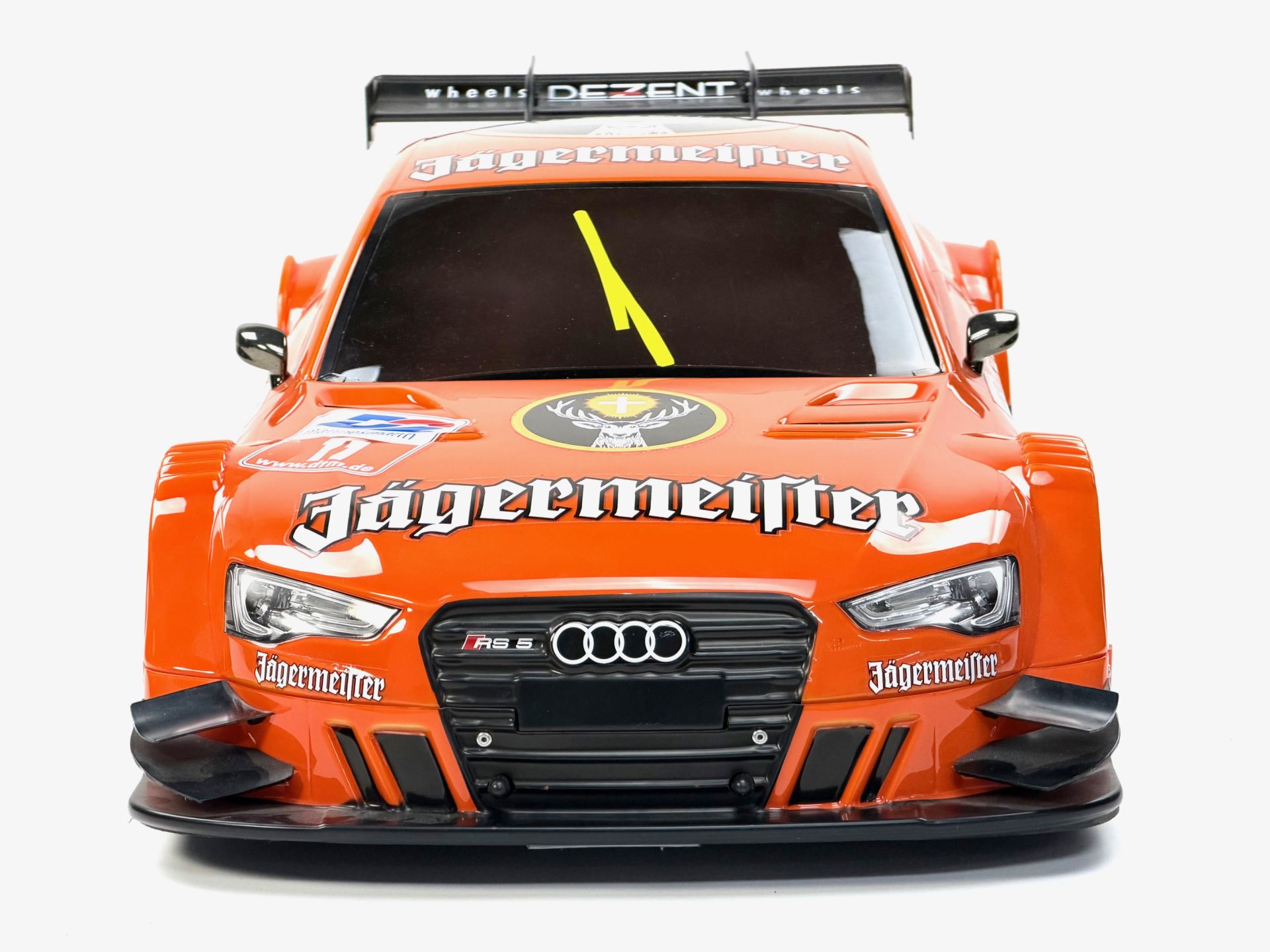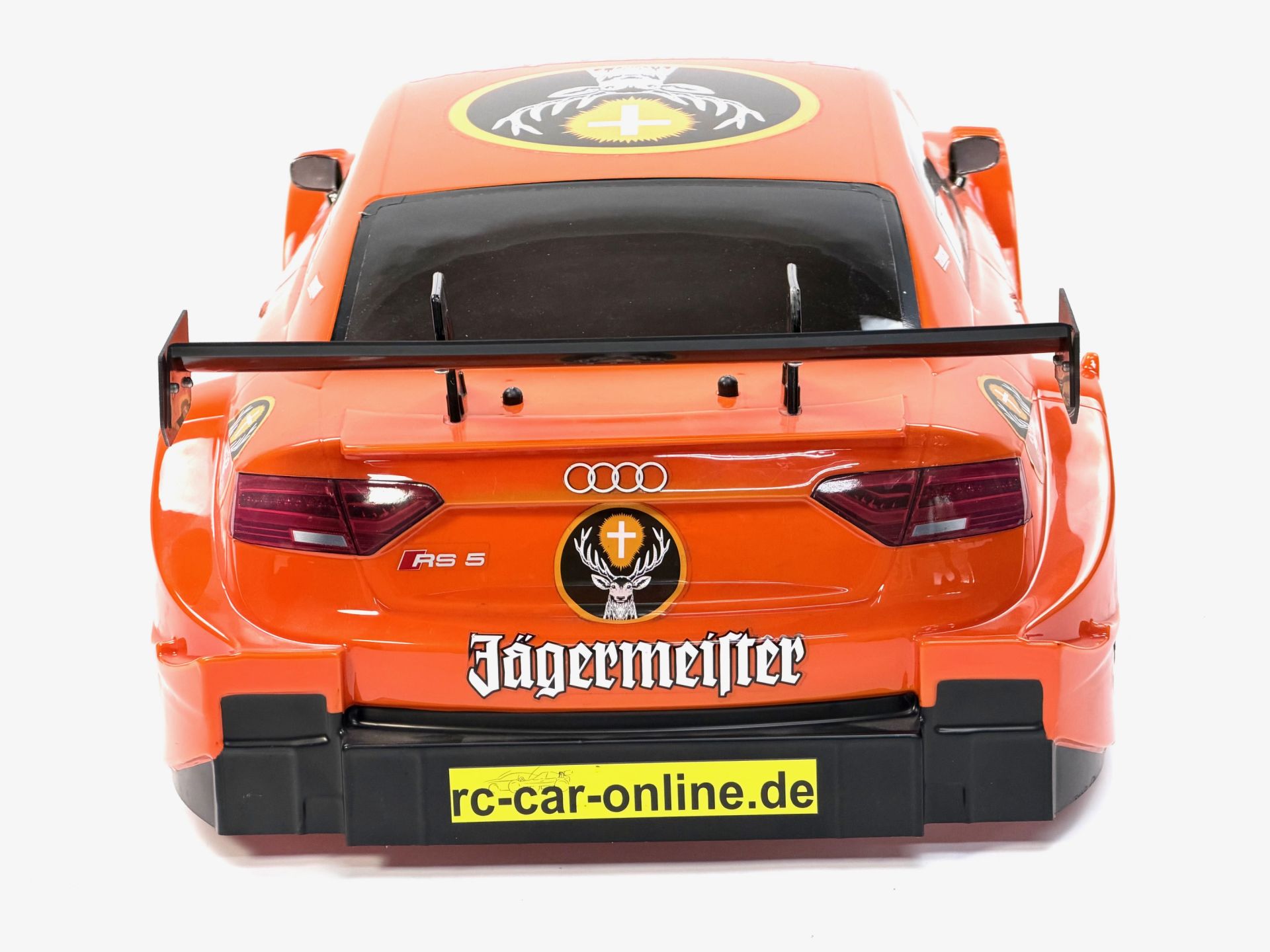 Painted Audi RS5 DTM body shell with Team Audi-Jägermeister paint sheme for 1/5 cars with 530/535 mm wheelbase.With rear wing, flaps and decal sets for car and Jägermeister paint sheme.The body shell does not come with drilled mounting holes to make it possible to fit any 1/5 car with 530/535 mm wheelbase.This Audi RS5 DTM body shell is also available clear with part number y1441.Required body mounts:Mount front: FG 7020/14 Front bumper Rear body mount: FG 7152/01 Rear body mount Side body mount front: FG 3014 Body mounts Side body mount rear: FG 3014 Body mounts / for 4WD: FG 7014/02 Body mount