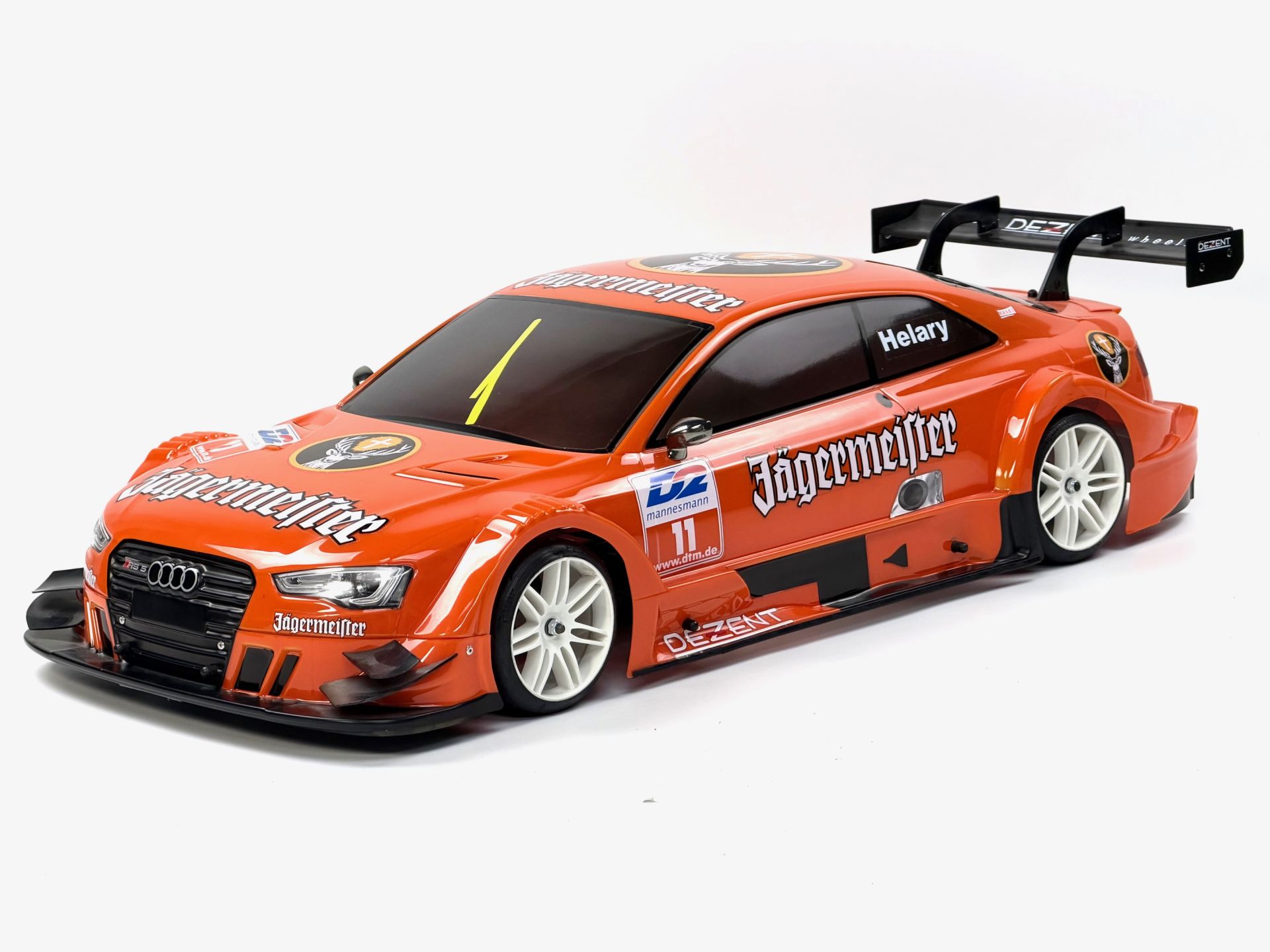 Painted Audi RS5 DTM body shell with Team Audi-Jägermeister paint sheme for 1/5 cars with 530/535 mm wheelbase.