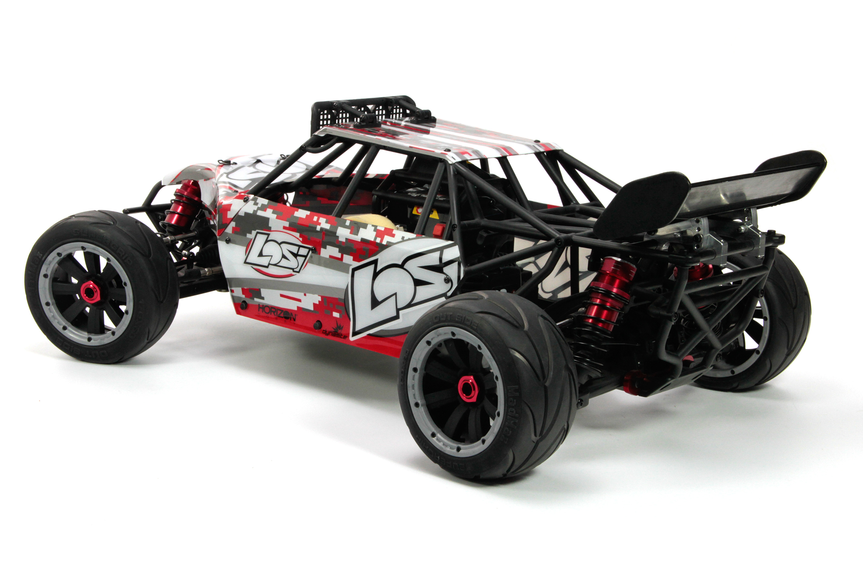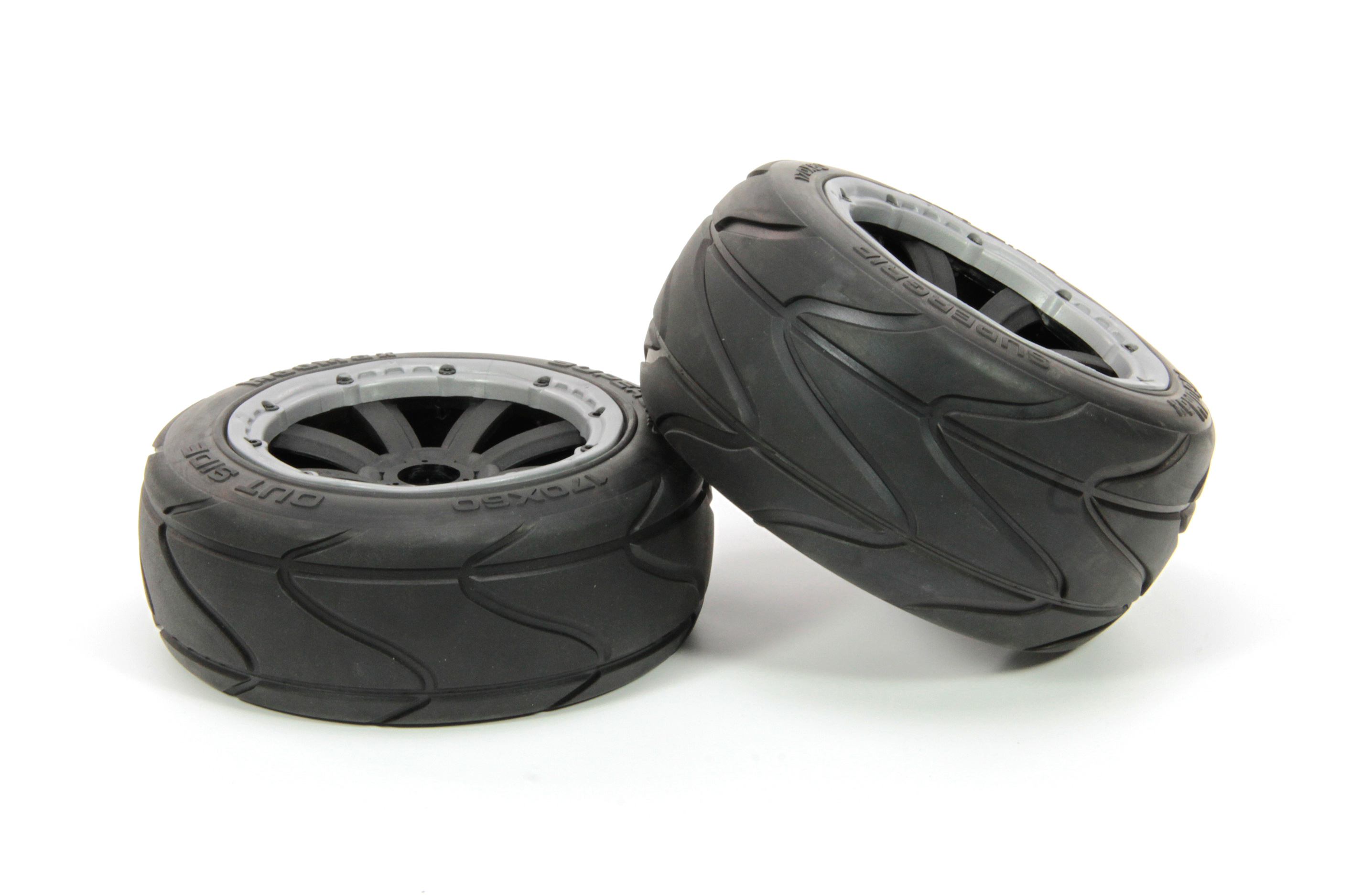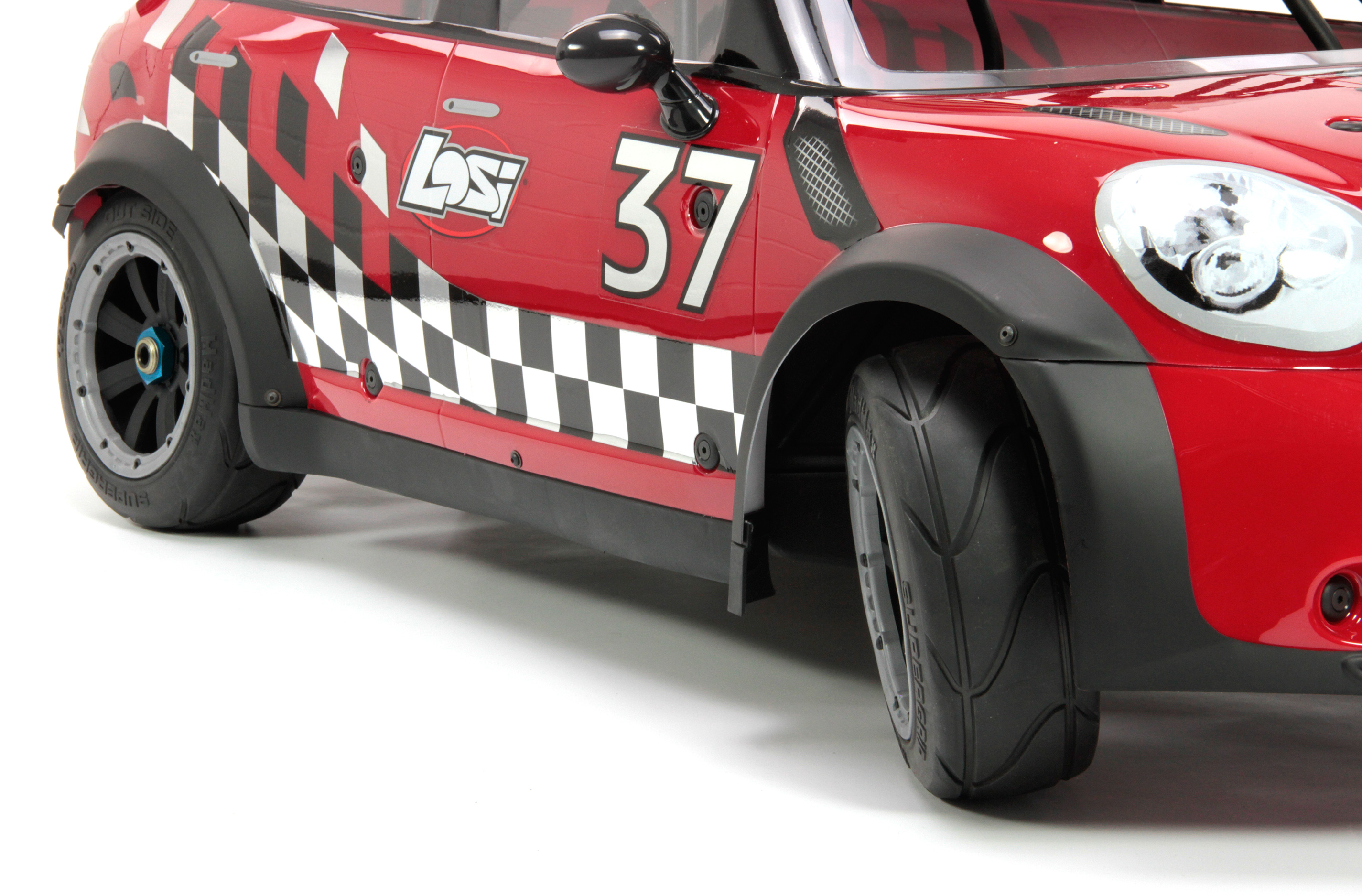 On most 1/5 and 1/6 cars the best combination is the use of 60 mm wide front and 80 mm wide rear tires. The Losi 5ive-T Mini should run 60 mm wide MadMax SUPERGRIP tires all around, because the 80 mm wide SUPERGRIP tires are a bit too wide for the Mini body shell.