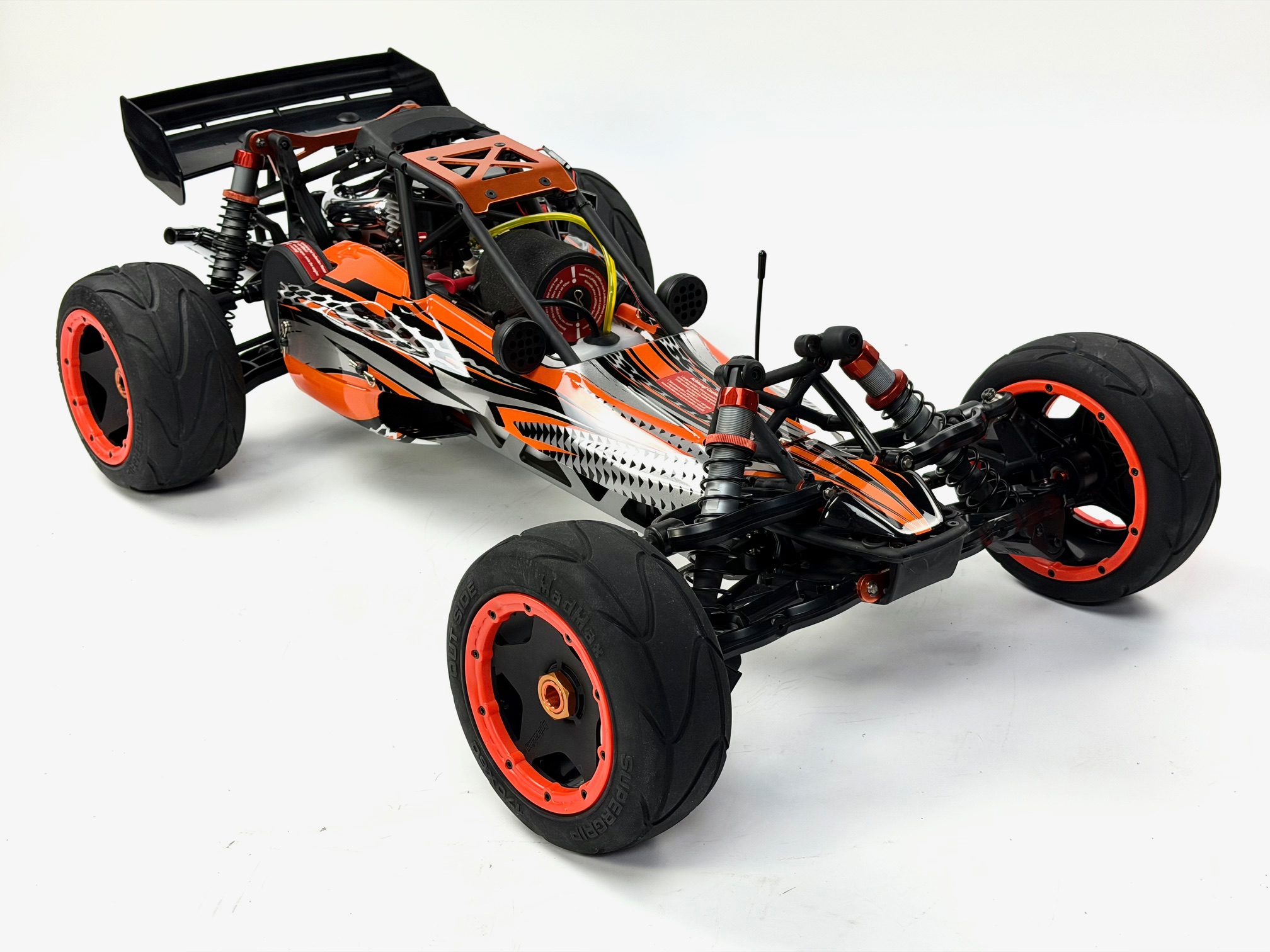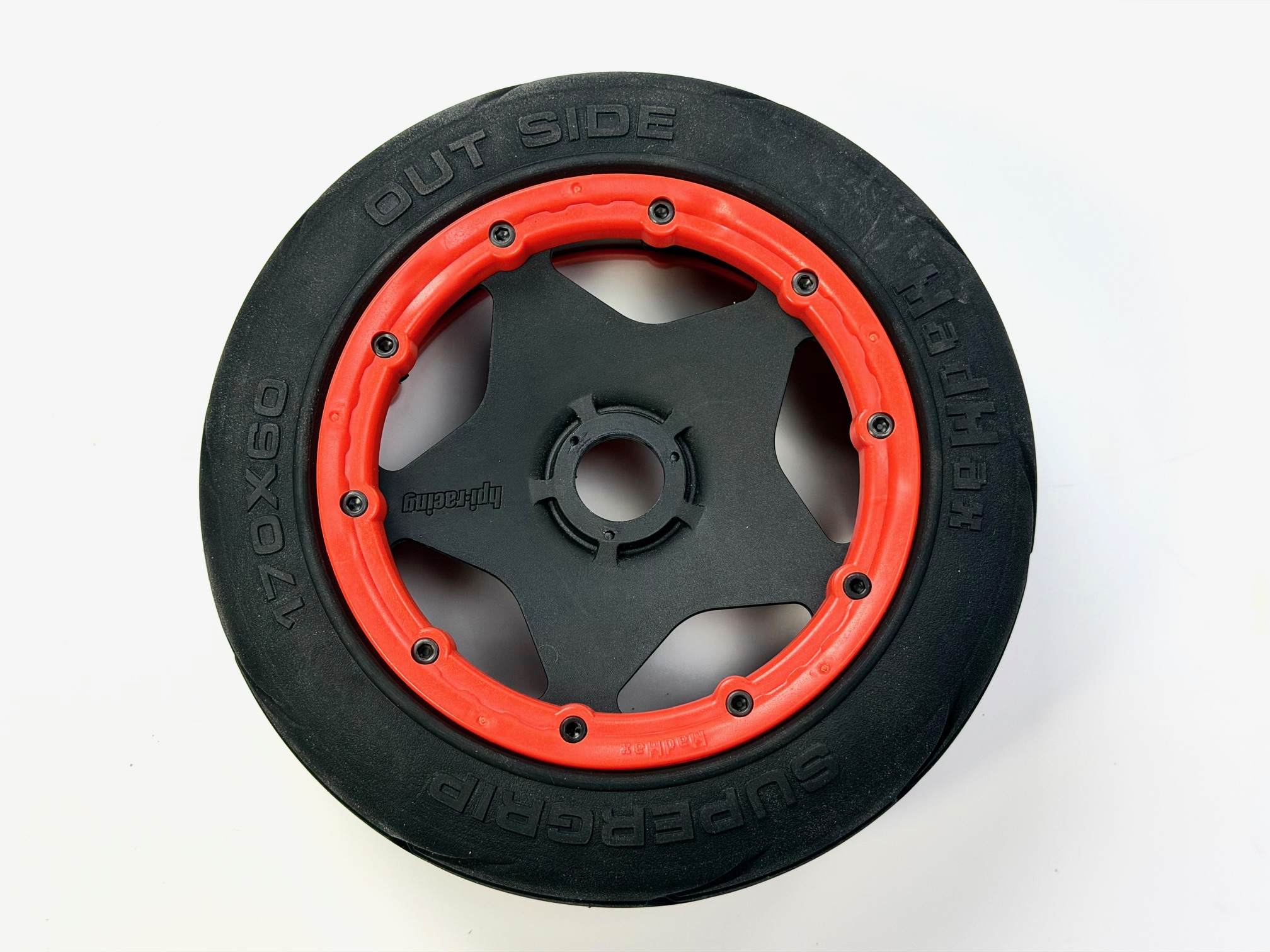 1 pair SUPER GRIP Soft tires 170 x 80 mm with black HPI rims for 24 mm hex wheel drive, 20 beadlock screws per rim and reinforced orange beadlock rings. Fits Losi 5ive-T, 5ive Mini, Desert Buggy XL and all HPI Baja 5B and 5T/SC cars.