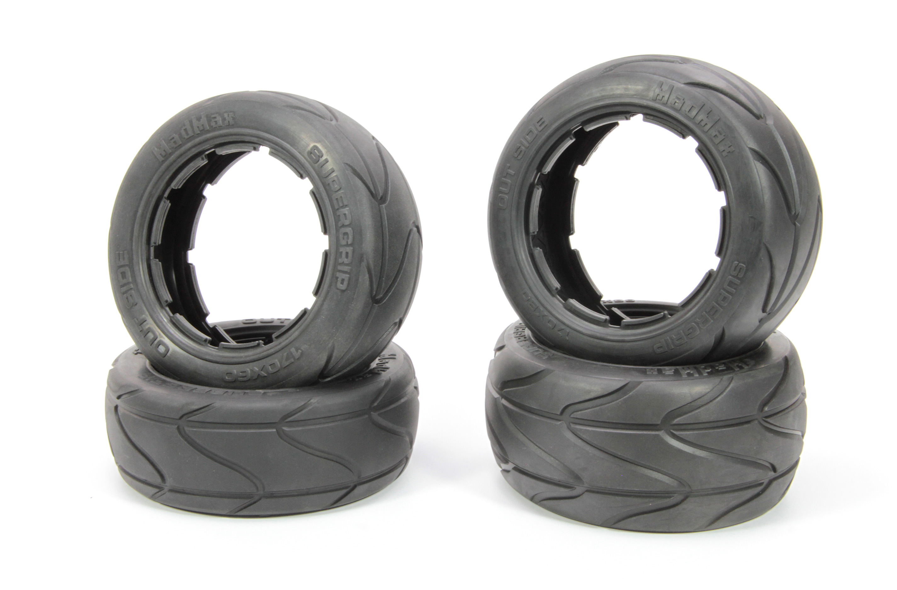 On most 1/5 and 1/6 cars the best combination is the use of 60 mm wide front and 80 mm wide rear tires. The Losi 5ive-T Mini should run 60 mm wide MadMax SUPERGRIP tires all around, because the 80 mm wide SUPERGRIP tires are a bit too wide for the Mini body shell.