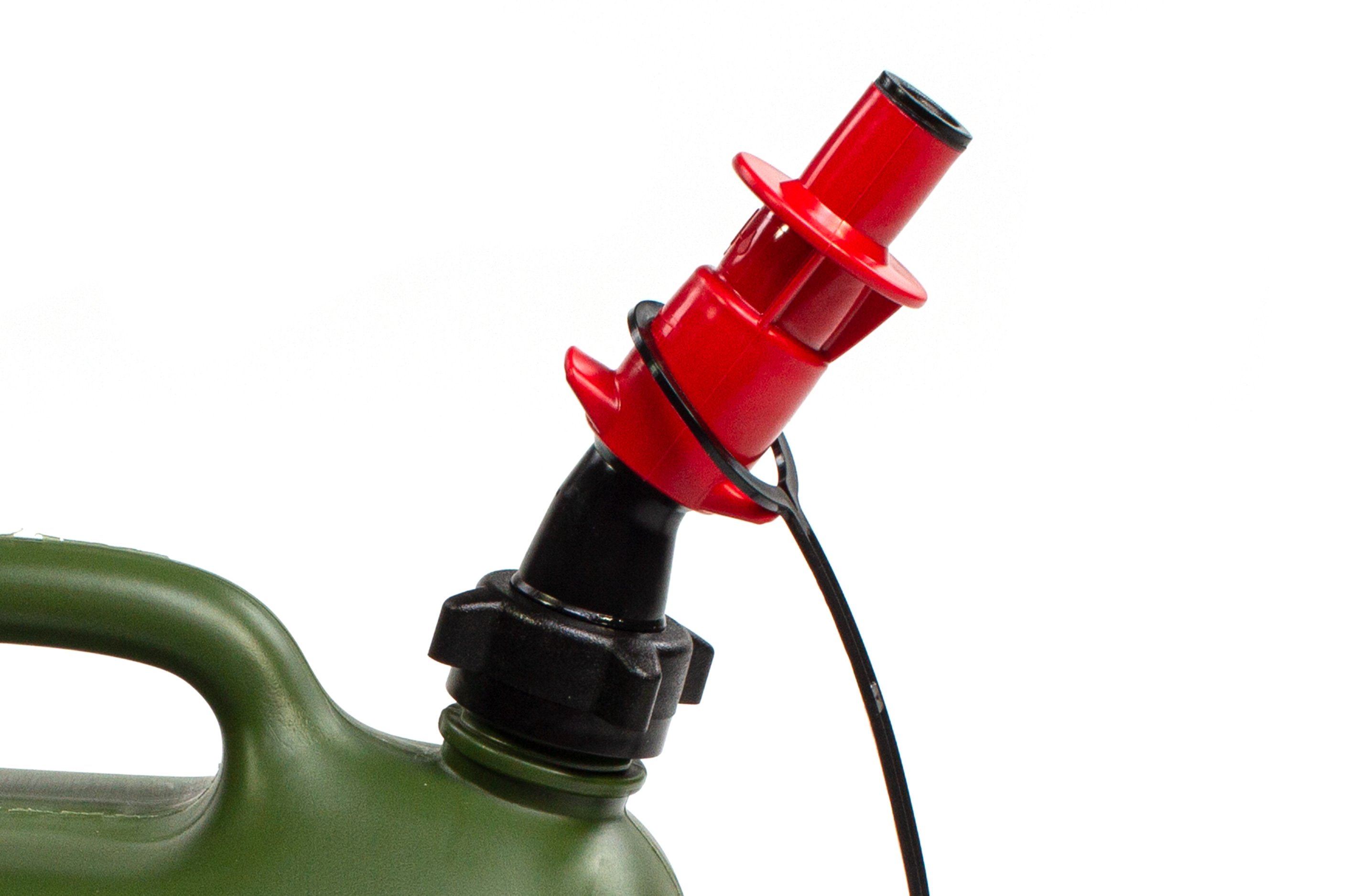 The environmentally friendly filling system reduces the escape of fuel vapors during and after refueling and thus protects against contamination. A union nut is included for exact positioning of the system at small tank openings. In addition, the filler is equipped with a retaining loop so that it can be securely attached to the jerry can.