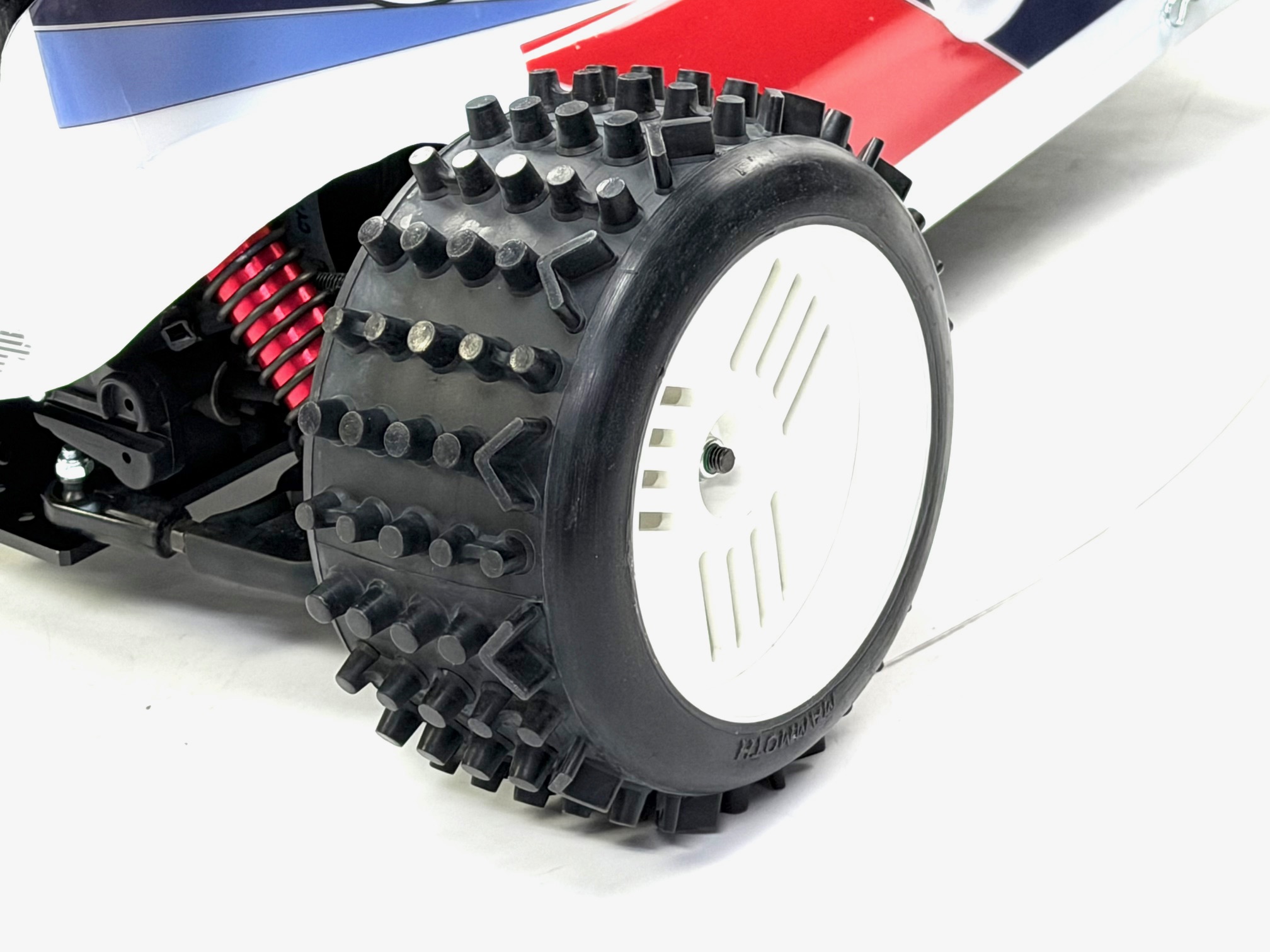 1 pair The V-Pin competition tyre hard on white Leopard rim is particularly suitable for tracks with loose and sandy surfaces. The combination of V-Pin on the rear axle and V-Pin on the front axle has also proven to be particularly effective. By trimming the tread, you can optimally tune your model with the V-Pin tyres. Partial or even almost complete trimming of the V-Pin tread on the respective outer side of the tyre has an extreme effect on cornering grip (sideways control) in particular.