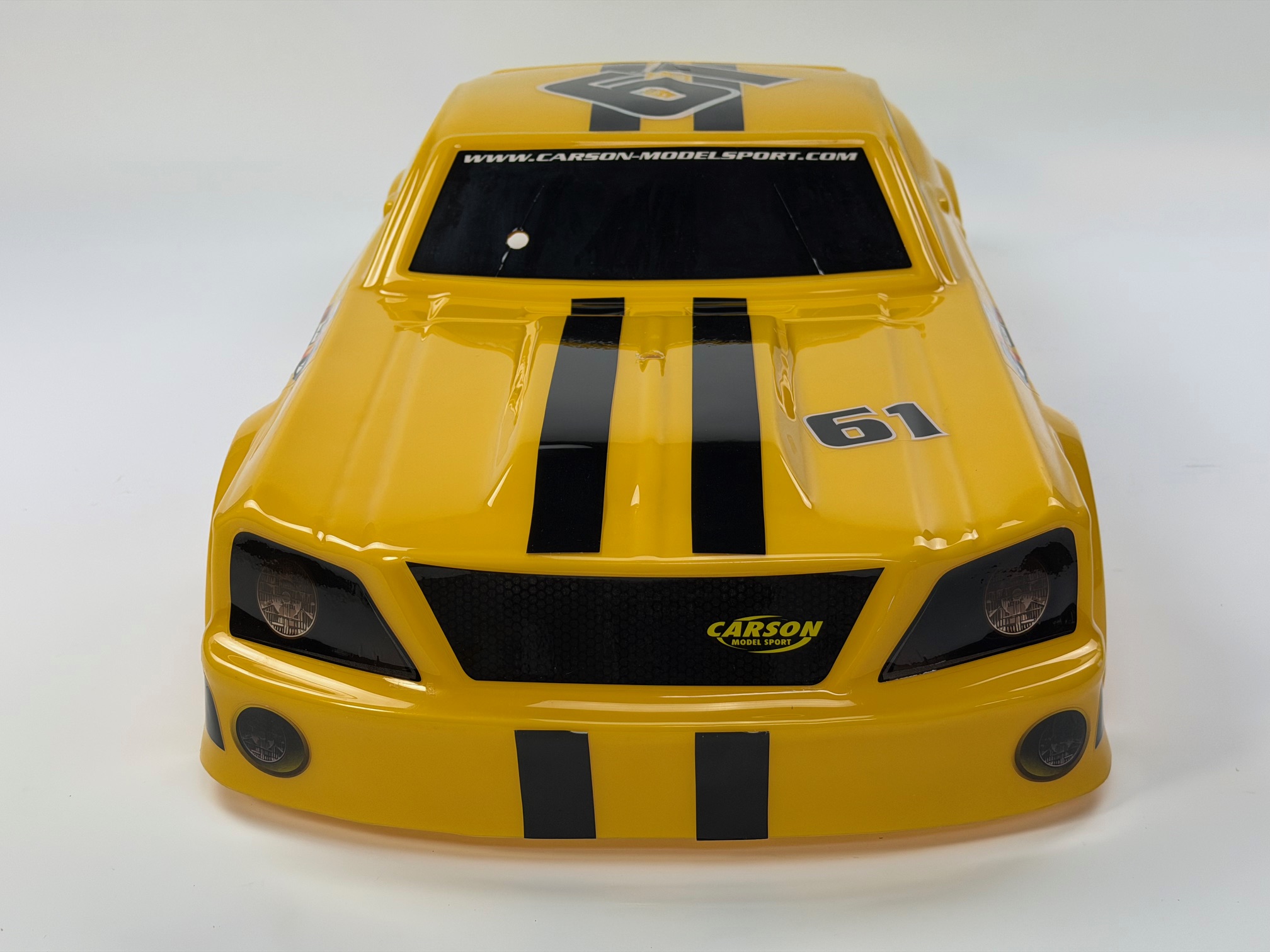 Original Carson/Smartech Artikel.Leider hat die Karosserie leichte Verformungen durch Falschlagerung und ein einen kleinen Riss hinten unten, und wird deshalb als gebraucht verkauft.Zustand siehe Fotos.Die aufgeklebten Streifen bei den Karosserien nicht besonders sorgfältig verklebt und sollten individuell nachgearbeitet werden, wenn man darauf Wert legt. Die Karosserie wurde aus 2 mm dickem Lexan tiefgezogen.Ein Fenster ist zur besseren Luftzirkulation ausgeschnitten und die Löcher sind für Smartech/Carson Modelle gebohrt.MaßeLänge: 890 mmBreite: 392 mmHöhe: 220 mmBenötigte Karosserieträger:Frontteil: FG 7020/16 FrontrammerHeckträger: FG 7152/01 Karosserieauflage hintenSeite Front: FG 3014 KarosseriehalterSeite Heck: FG 3014 Karosseriehalter