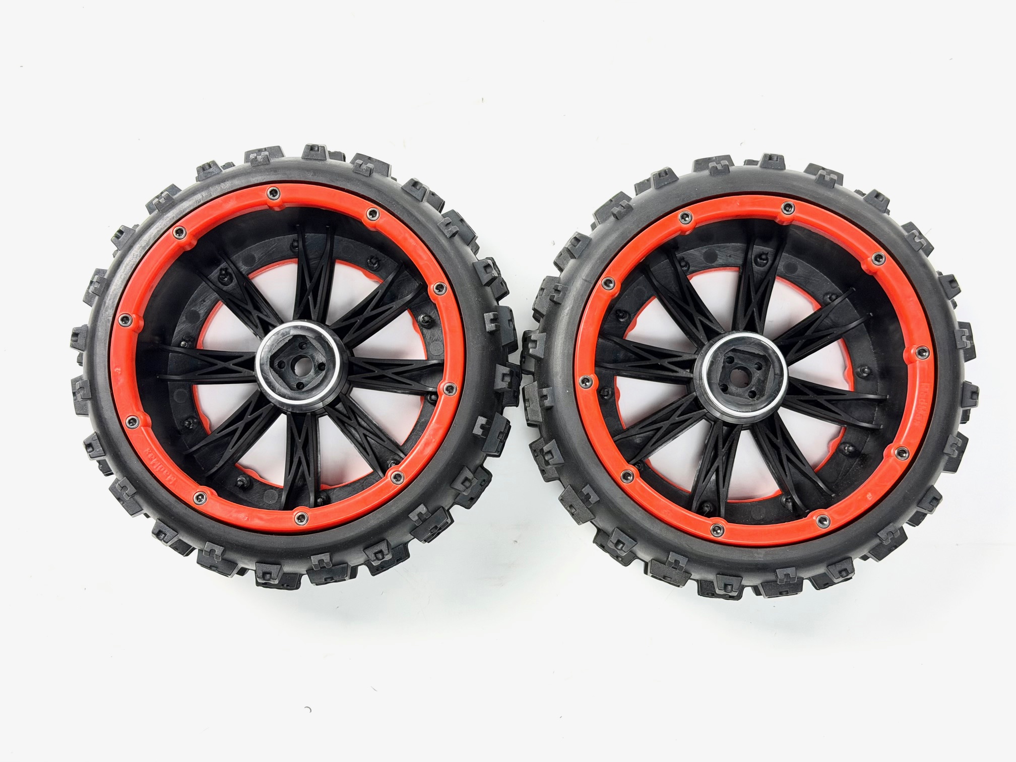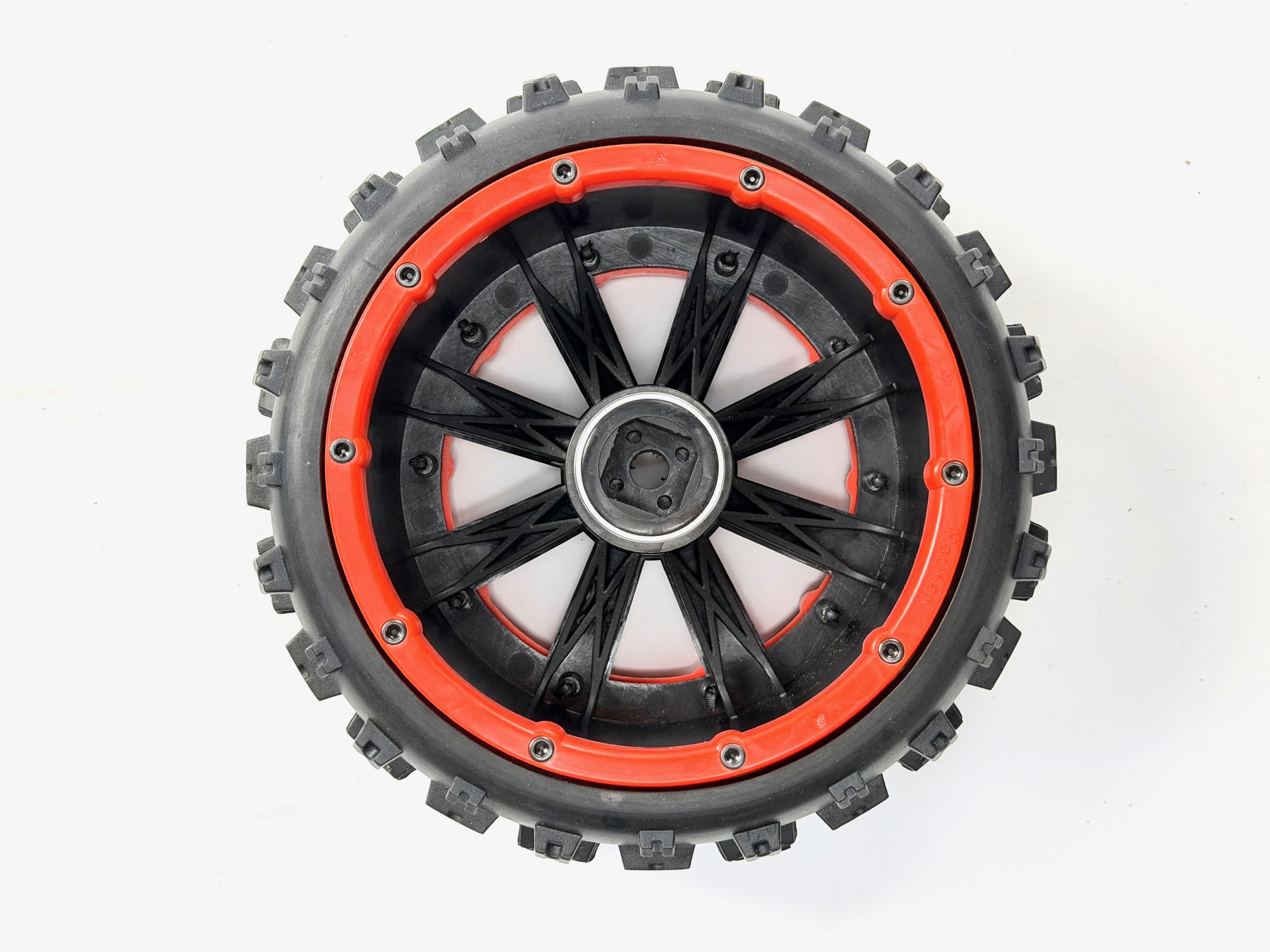 CROSS BOND Reifen 170 x 60 mit MadMax Extreme 20-fach verschraubter Felge mit 18 mm Vierkantaufnahme und verstärkten orangenen Felgenringen wurden für den Einsatz auf losem Untergrund konzipiert. Die extrem formstark und unterschiedlich strukturierten Stollen des CROSS BONDS ermöglichen eine optimale Kraftübertragung und vermitteln, auch bei losem Untergrund, wie z.B. Sand und Erde, einen hervorragenden Grip. Die Stollen sind zur Reifenaußenseite erhöht und verschaffen somit, speziell in Kurven, wenn der Reifen nach außen kantet, maximalen Grip.