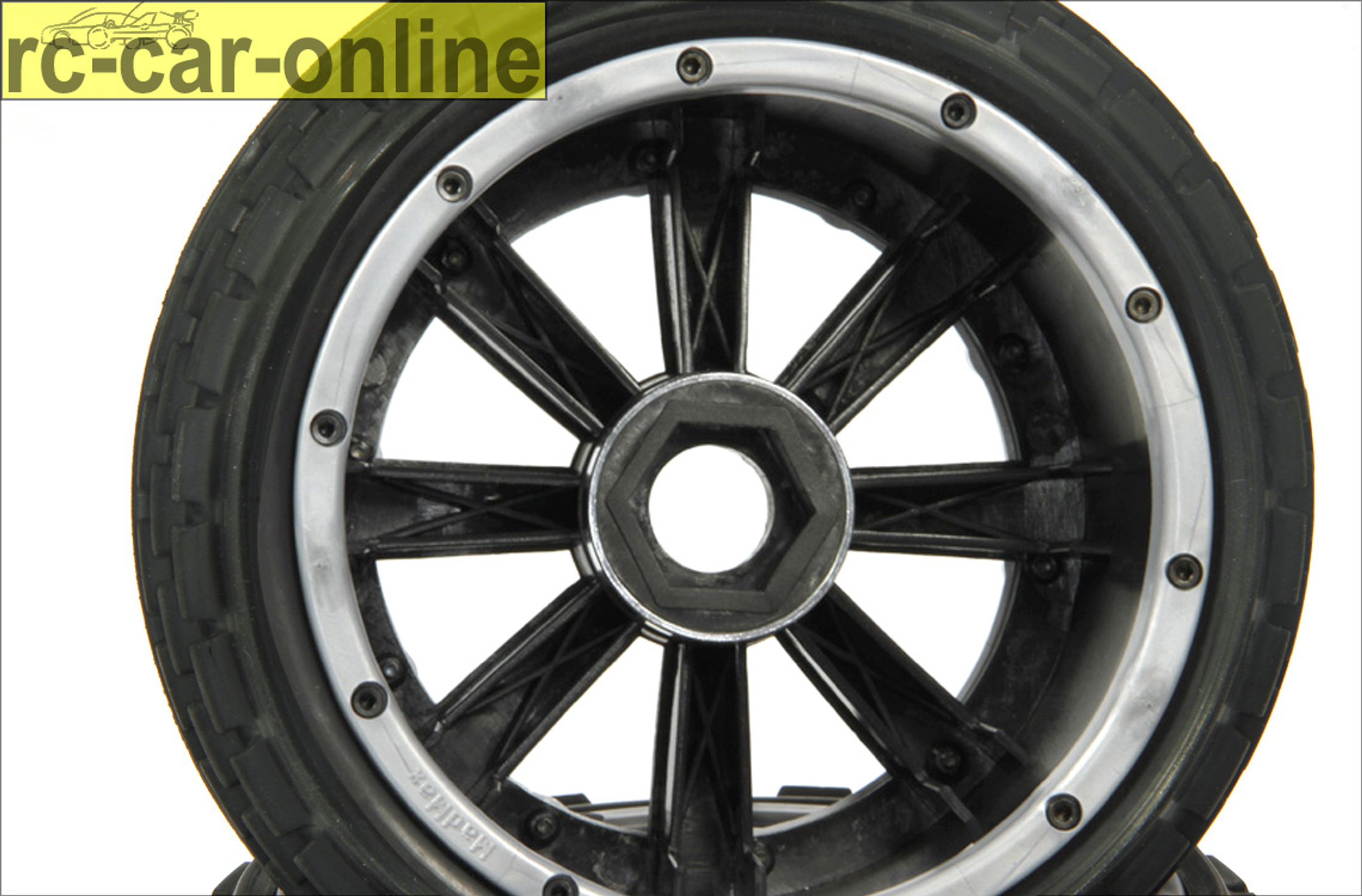 Das Komplettset besteht aus zwei Stück 60 mm und zwei Stück 80 mm Reifen, oder zwei Paar 60 mm Reifen für den Losi 5ive-T bei einer Karosserie mit abgedeckten Rädern (wie bei der originalen Karosserie), inklusive Reifeneinlagen und MadMax EXTREME Felgen!