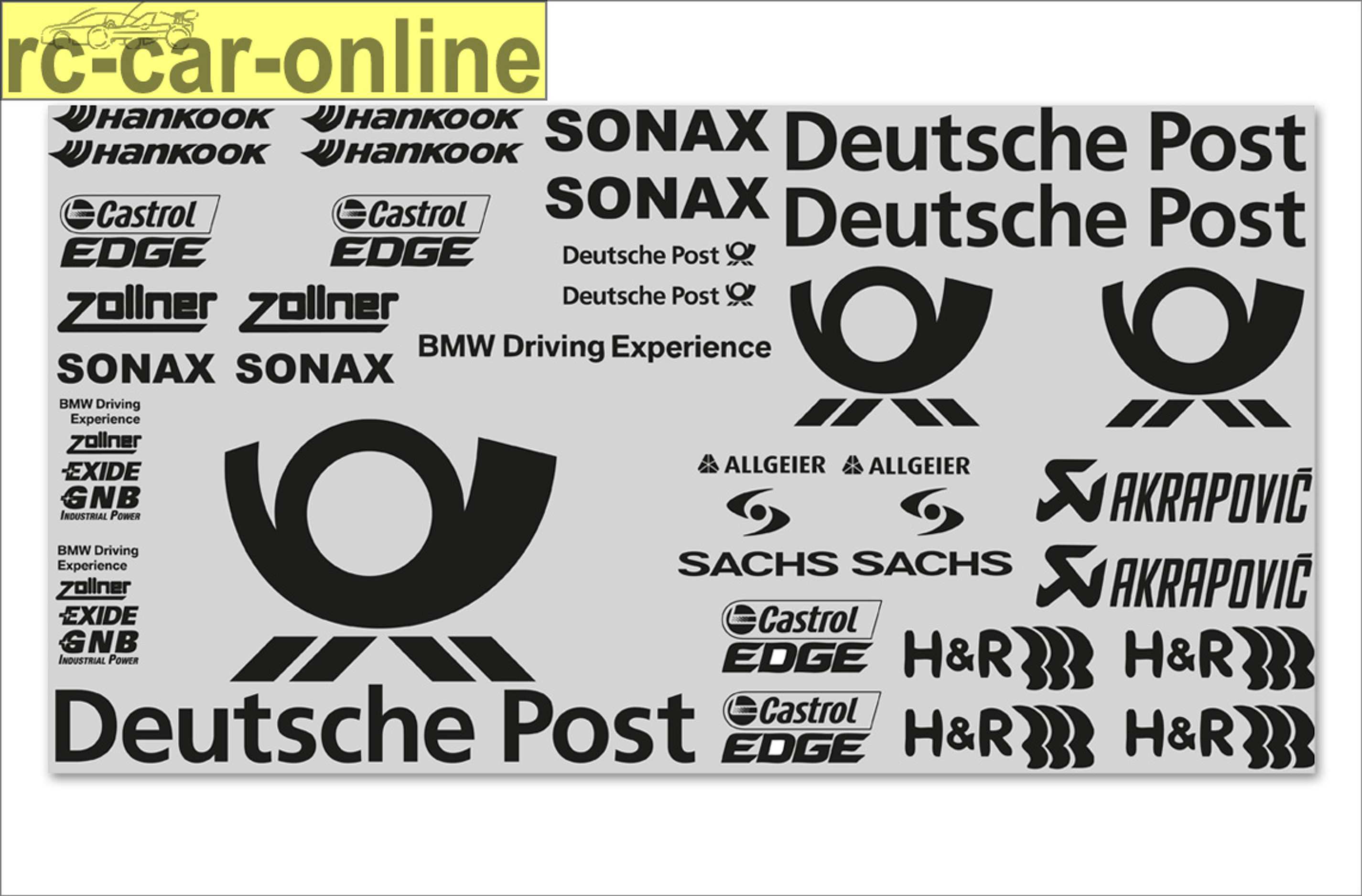 Dieser Dekorbogen beinhaltet folgende Hersteller-Aufkleber: Deutsche Post, Hankook, Sonax, Castrol, EDGE, Zollner, Sachs, Allgeier, H&R, Exide, GNB.