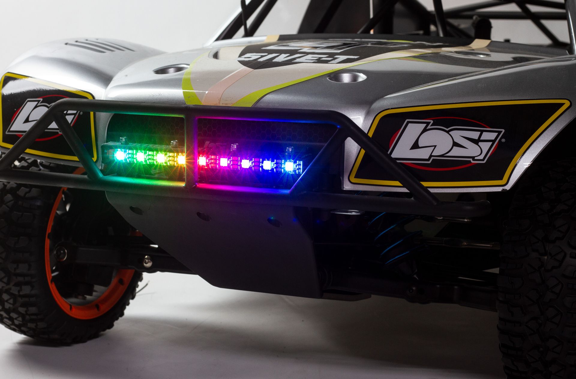 Ein "must have" für jede Nachtfahrt. In diesem LED Modul sind insgesamt 11 verschiedene Lichteffekte eingespeichert. Die Lichtleiste ist maßgleich mit der des Losi 5ive-T 2.0 und des Losi DBXL-E, wodurch deren Halterungen verwendet werden können.