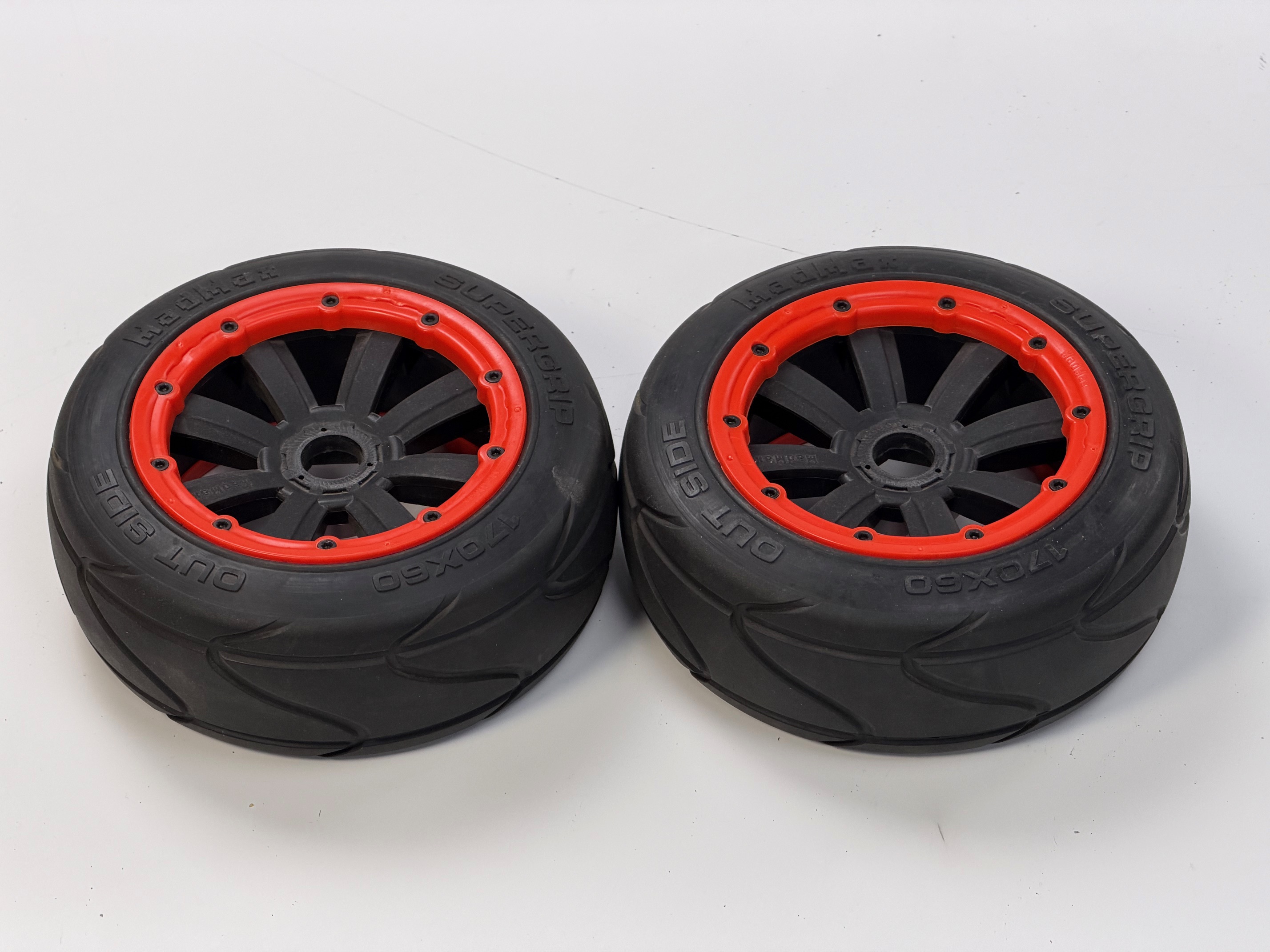 SUPER GRIP Soft Reifen 170 x 60 mm mit schwarzen MadMax Extreme Felgen 20-fach verschraubt mit 24 mm Sechskant-Aufnahme und verstärkten orangen Felgenringen für Losi 5ive-T, 5ive Mini, Desert Buggy XL sowie allen HPI Baja und 5T Modellen.