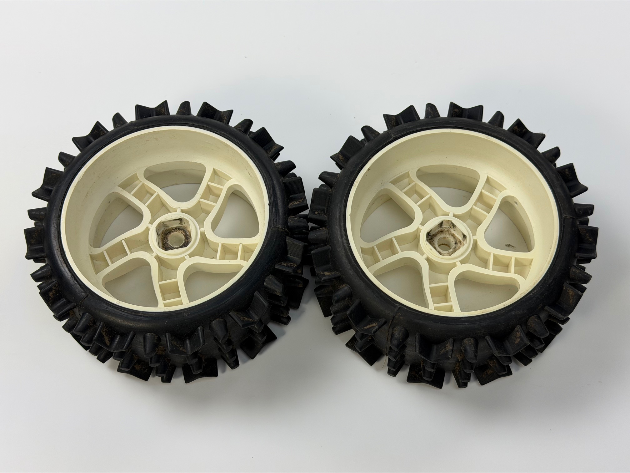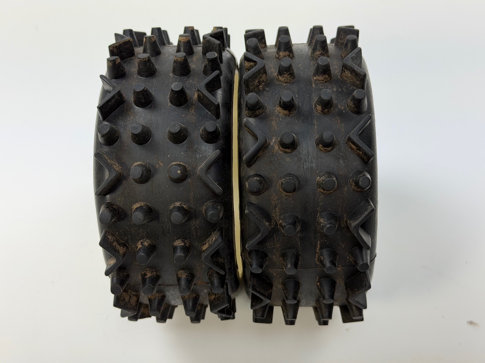 Gebrauchter Off-Roadreifen komplett auf weißer Felge.