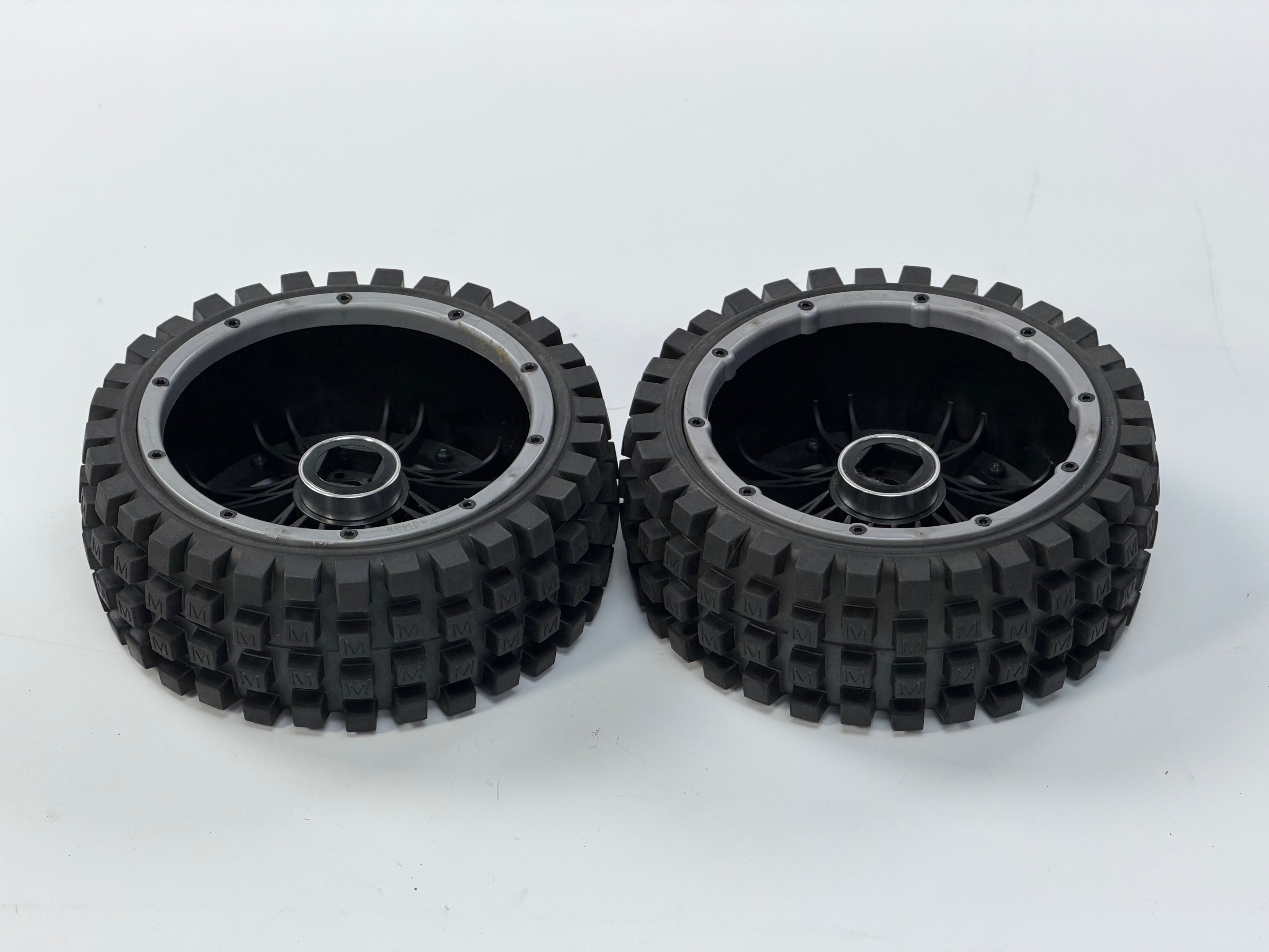Die Reifen haben 128 Stück, mehr als 1 cm² große und 6 mm hohe, extrem formstarke Stollen ermöglichen eine optimale Kraftübertragung und ermöglichen, auch bei losem Untergrund, wie z.B. Sand und Erde, einen hervorragenden Grip. Die Reifen sind mit einer speziellen formsteifen Reifeneinlage bestückt, die auch bei schwereren Modellen, die anliegende Kraft überträgt, ohne zu verkanten. Wir empfehlen die Verschraubung der Felgen nach dem Einsatz zu kontrollieren.